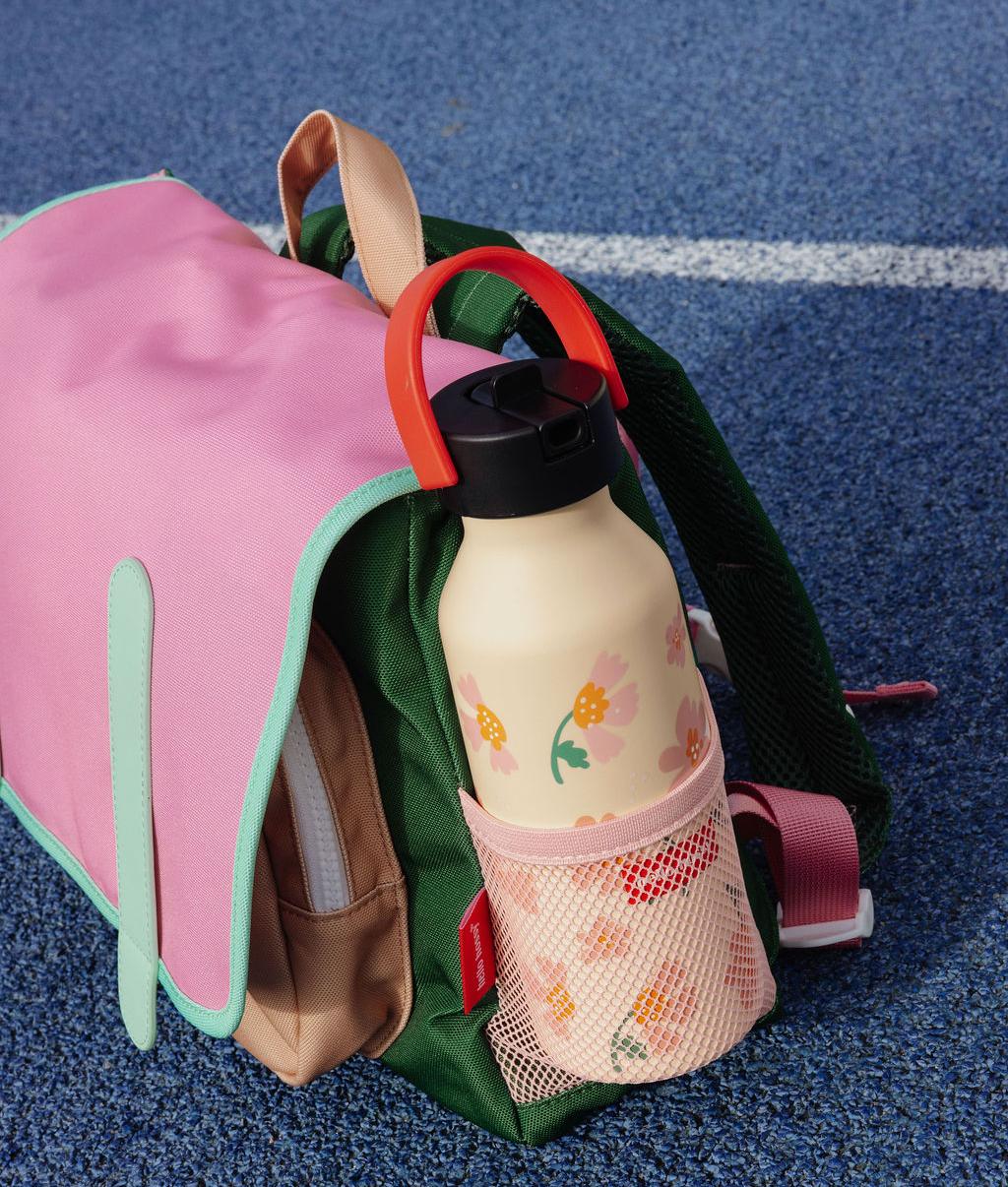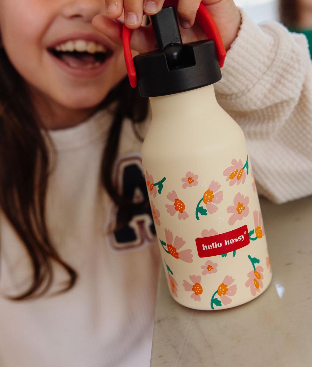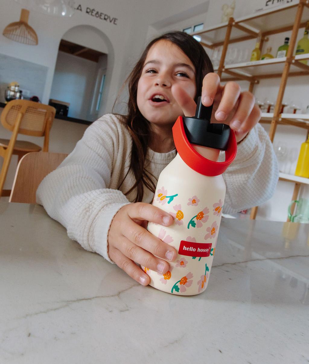 Découvrez la Gourde Isotherme pour enfants, Springtime. 350ml ou 500ml, base anti-dérapante, anse de transport et paille amovible, 100% isotherme, 100% pratique. À assortir à notre casquette et sac à dos du même Nom.