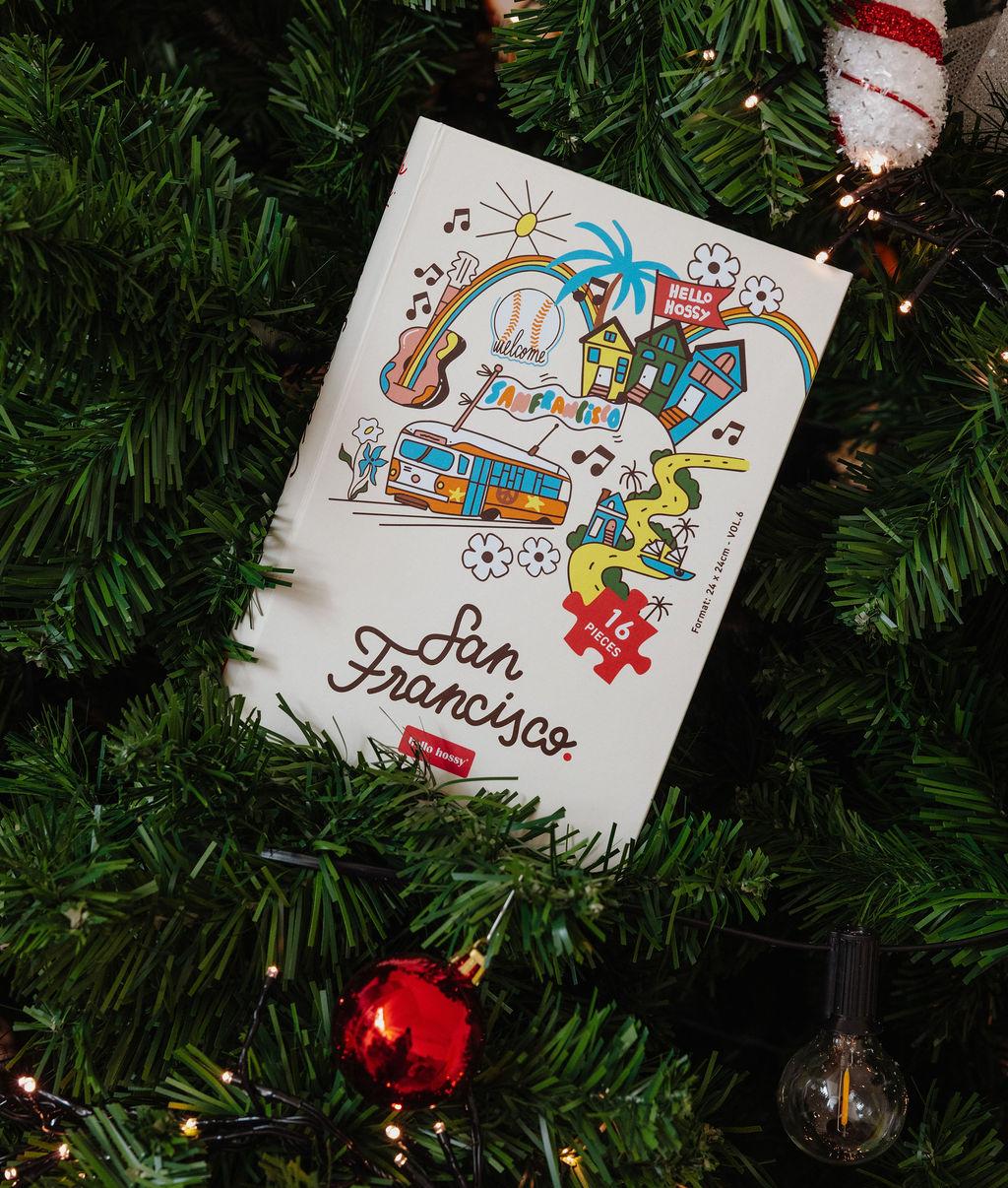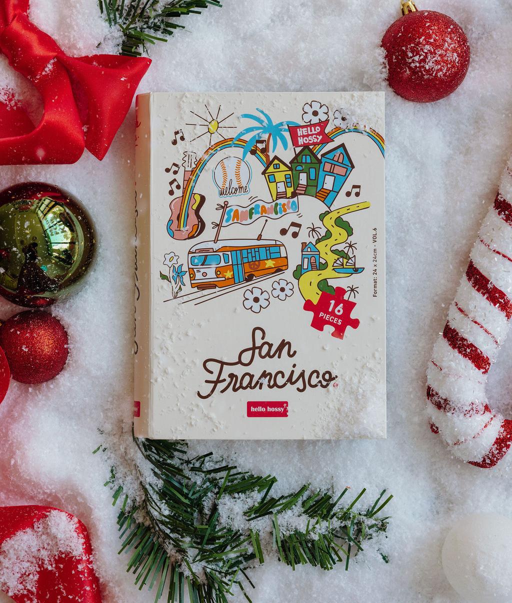 Descubre el Rompecabezas San Francisco para niños. 16 piezas, ideal a partir de 3 años. Ilustración icónica, cartón reciclado, piezas fáciles de manejar. Embalaje formato libro para utilizar como objeto decorativo o caja de almacenamiento. Para regalar o coleccionar.